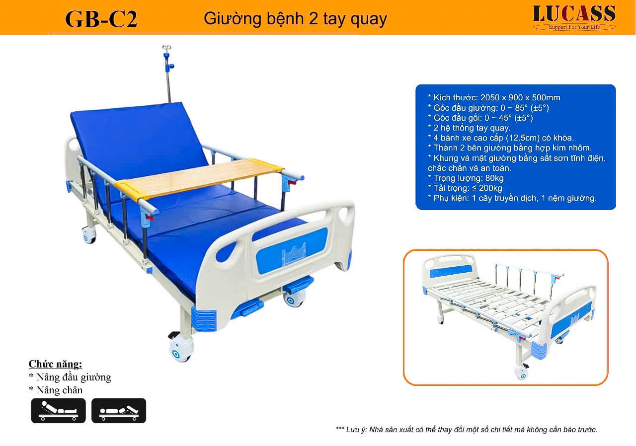 Giường y tế 2 tay quay Lucass GB-C2 thuộc dòng giường bệnh nhân điều khiển bằng tay quay được sử dụng nhiều trong y tế như phòng khám đa khoa, bệnh viện,... Giường y tế 2 tay quay được thiết kế bắt mắt, thẩm mỹ cao và rất chắc chắn. Giường được sử dụng trong các bệnh viện, phòng khám cũng như được nhiều người mua về nhà để tiện sử dụng trong việc chăm sóc người bệnh tại nhà.