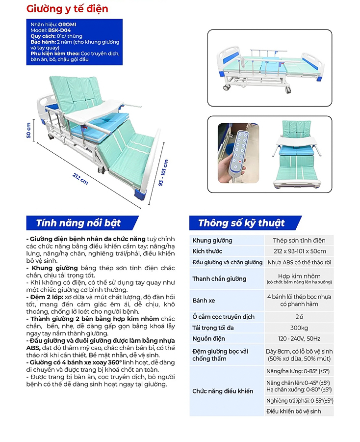 Giường Bệnh Nhân Điện Cơ Oromi BSK-04 - Thiết Bị Hỗ Trợ Chăm Sóc Đa Năng