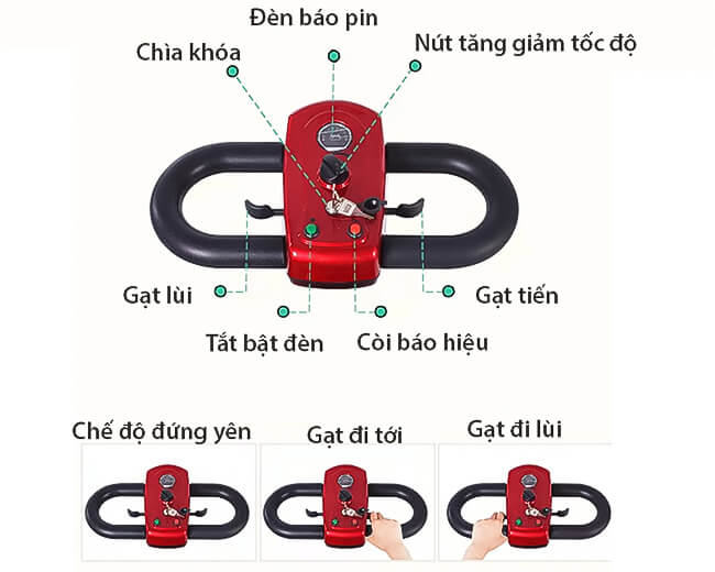 Trên cụm tay lái được bố trí chìa khóa, đèn báo pin, công tắc đèn, nút tăng giảm tốc độ và cần gạt tiến – lùi. Thiết kế này cực kỳ phù hợp với người tay chân yếu hoặc đang phục hồi chức năng sau tai biến.