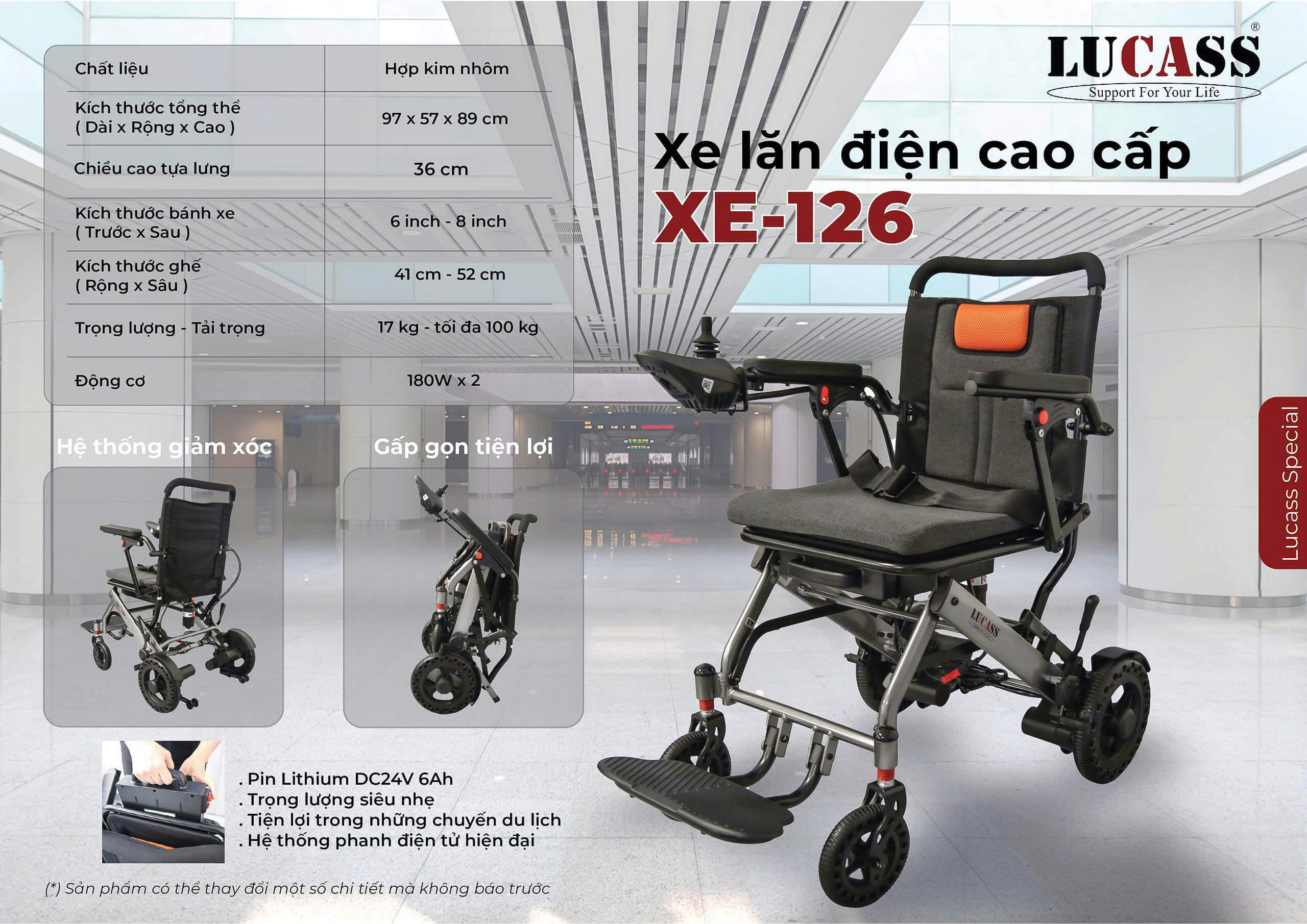 - Xe lăn điện du lịch cao cấp Lucass XE-126 không chỉ là một phương tiện, mà là một khoản đầu tư cho chất lượng cuộc sống và sự tự do. Với thiết kế tiên tiến, Lucass XE-126 đã định nghĩa lại khái niệm về xe lăn du lịch Lucass XE-126 tiện lợi, an toàn và thẩm mỹ.