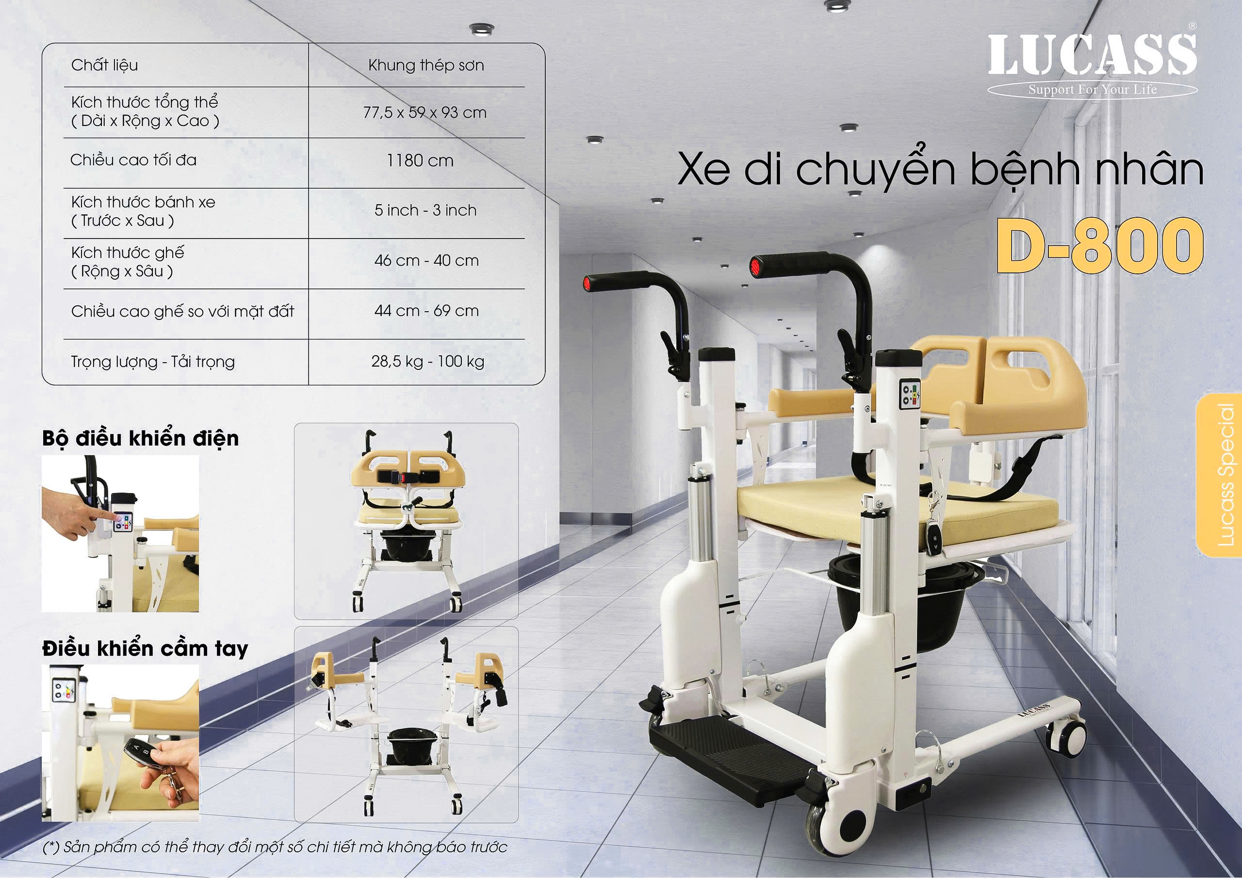 - Sản phẩm D-800 được thiết kế linh hoạt tối đa. Dùng để: Di chuyển nội khu, Hỗ trợ vệ sinh cá nhân, Tắm rửa, hoặc Chuyển đổi vị trí (từ giường sang xe lăn, sang bồn cầu...) một cách nhanh chóng và tiện lợi.